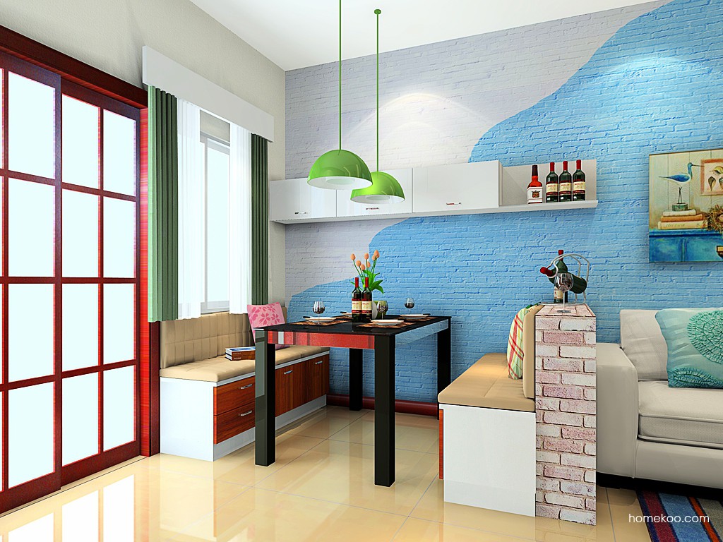 本方案风格为新实用主义,在在进门处设置了鞋柜和转角书柜的柜体组合,满足主人的要求,餐厅采用卡座式摆放,有效的利用餐厅空间。