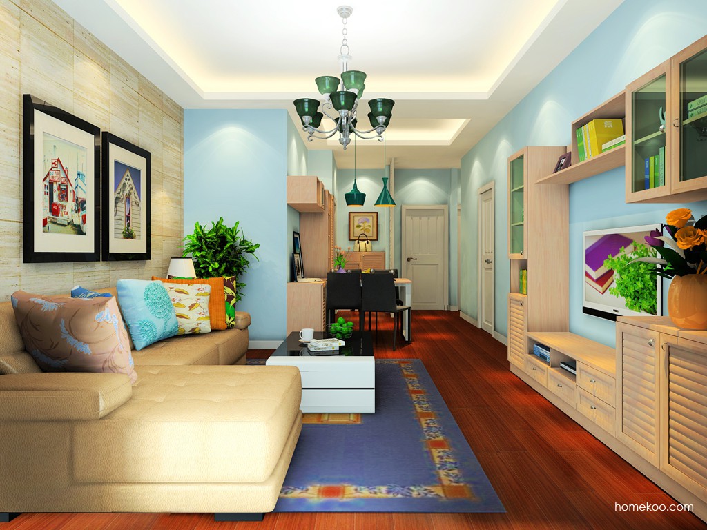 北欧阳光风格,在色彩上采用了黄色和蓝色系列搭配整个空间,错落有致的柜体与整个空间的色彩搭配,显得时尚、舒适,温馨。